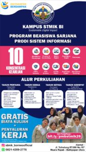 STMIK Borneo Internasional (STMIK BI) kembali membuka Program Beasiswa Sarjana Prodi Sistem Informasi sebagai bagian dari komitmen kampus dalam mendukung Diktisaintek Berdampak dan mencetak generasi muda yang unggul di bidang teknologi digital.